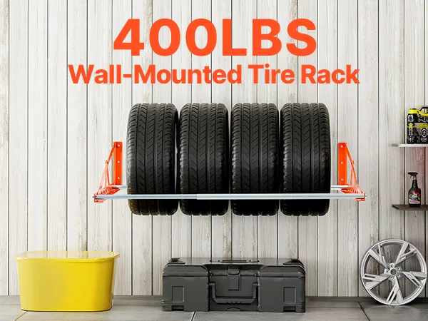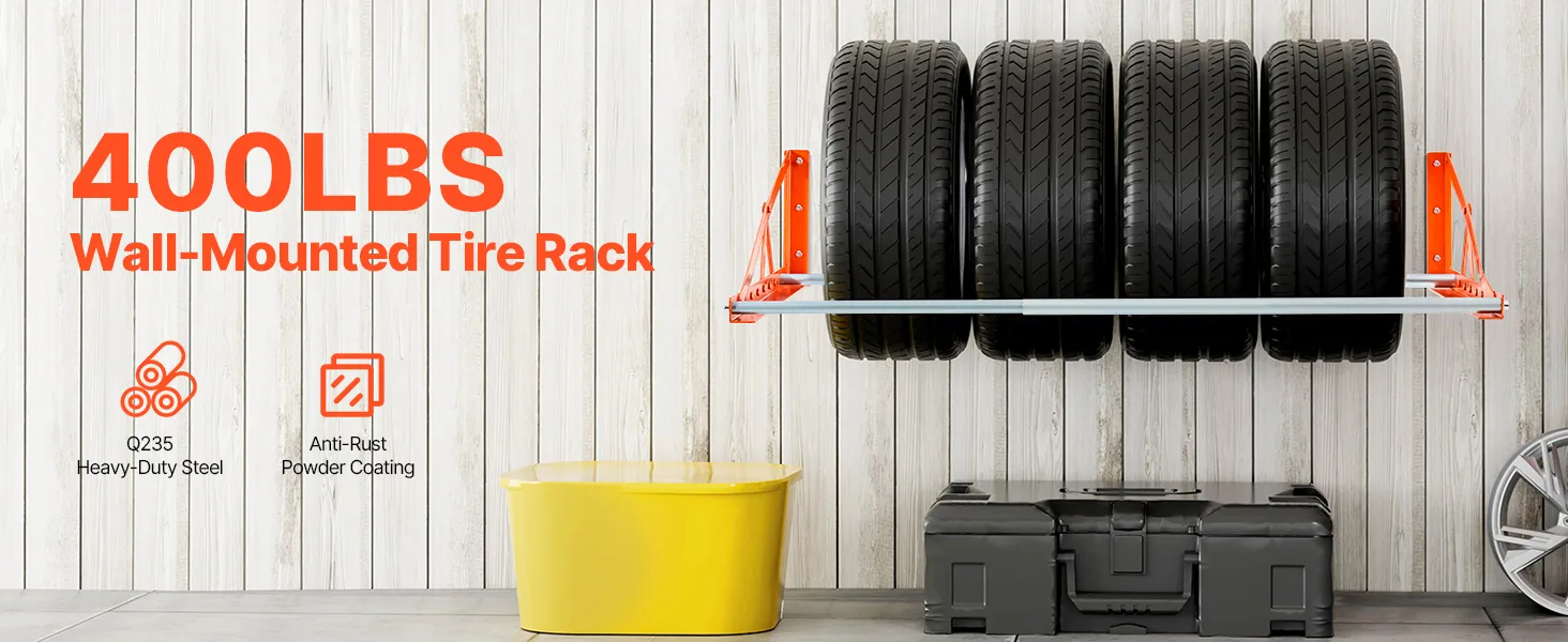 This heavy-duty wall-mounted tire rack is crafted from durable Q235 steel with rust-resistant powder coating, supporting up to 400 lbs. 31" - 56" adjustable length allows to store up to 4 standard tires off the ground, optimizing space and keeping your garage organized and clutter-free.