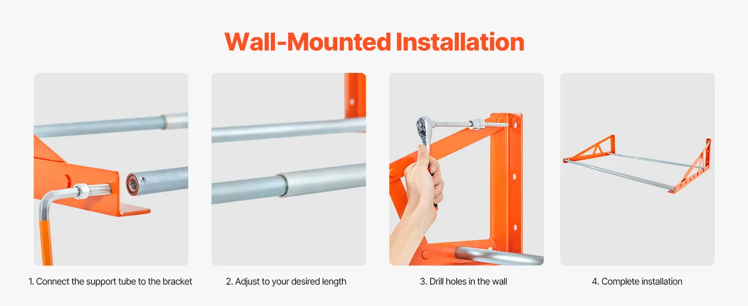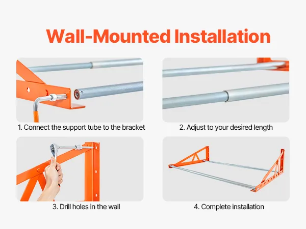 This wall-mounted tire rack is simple to install. Just choose your desired location and width, drill holes in the corresponding spots on the wall, and secure it with the provided screws. You can adjust length and relocate the rack as needed for a custom fit.