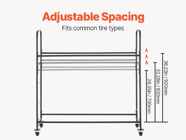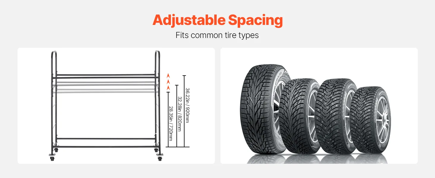 Maximize Your Space: Featuring a 2-layer design, this adjustable tire rack provides ample space to store up to 12 standard tires. It keeps your tires neatly organized, maximizing your storage area and ensuring a tidy garage or workshop.
