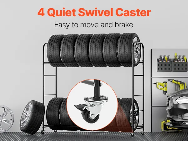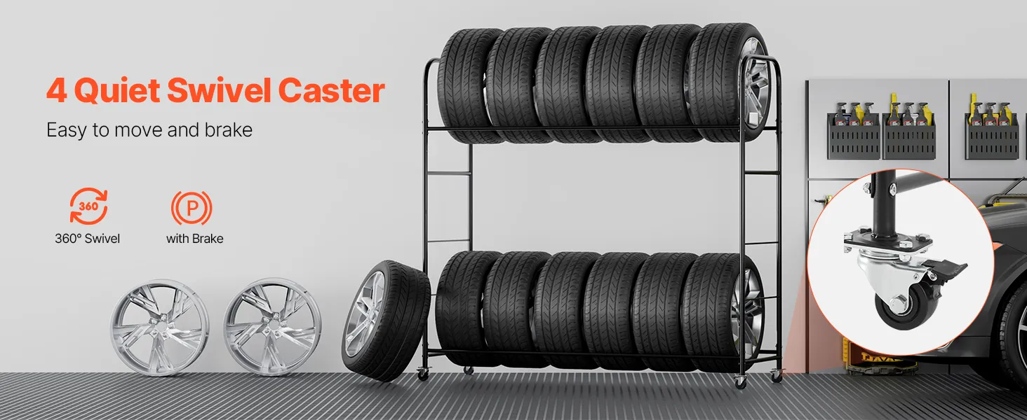 Equipped with four 360° swivel casters, this garage tire rack is easy to move around, even when fully loaded. The equipped brake keeps the tire holder securely in place when not in use, ensuring stability and safety.