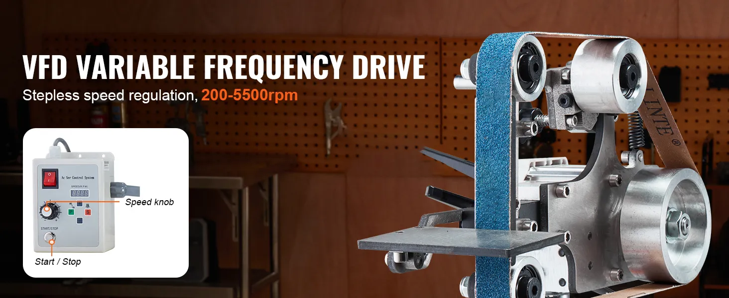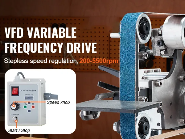 Met een bandsnelheid van 26 m/min en een VFD-frequentieomvormer maakt deze bandschuurmachine een traploze snelheidsregeling mogelijk. Schakel eenvoudig tussen snel slijpen op hoge snelheid en langzaam, fijn slijpen voor een grotere werkefficiëntie.