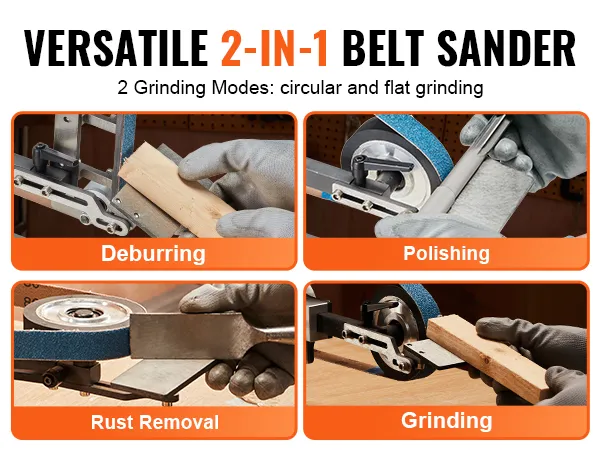 Veelzijdige bandschuurmachine: De VEVOR bankbandschuurmachine biedt 2 schuurmodi: rondschuren en oppervlakteschuren, wat veelzijdigheid biedt voor verschillende toepassingen. Of u nu metalen, kunststoffen, hout, glas of andere materialen schuurt, polijst of ontbraamt, deze bandschuurmachine is perfect om met gemak professionele resultaten te bereiken.