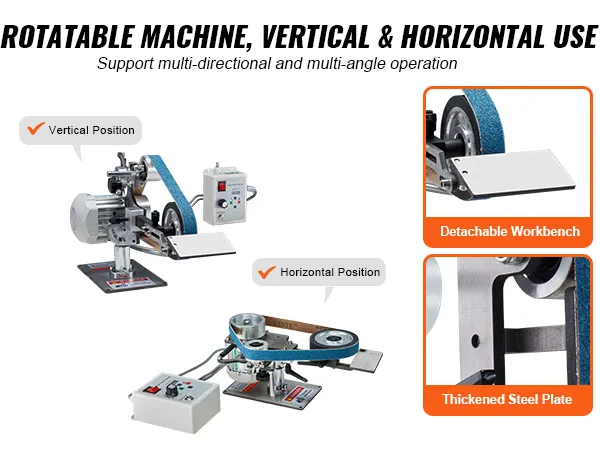 Of u nu de voorkeur geeft aan verticaal of horizontaal gebruik, deze bandschuurmachine kan verschillende hoeken aan. De stalen behuizing zorgt voor stabiliteit voor soepel werken en de afneembare werkbank helpt je de perfecte werkhouding te vinden.