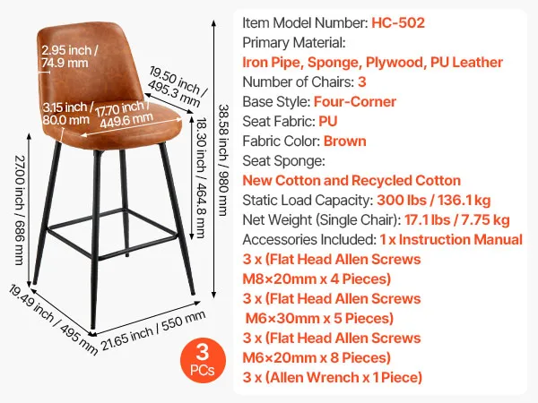 Practical Set: The set includes 3 bar stools, each measuring 19.49x21.65x38.58 in, with a seat height of 27 in. This bar chair is ideal for larger families or open kitchen layouts, transitioning between dining, socializing, and office activities
