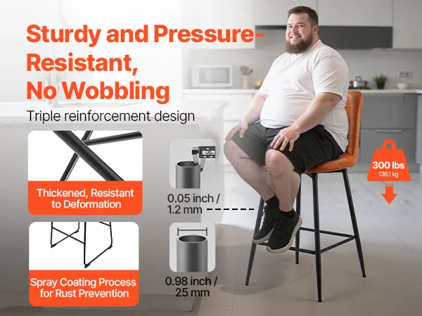 Strong and Stable Weight Support: The bar stools feature thickened iron pipes with stable structure, offering a maximum weight capacity of up to 300 lbs / 136 kg. The stool legs are coated with a spray finish for rust and scratch resistance