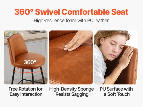 Comfortable and Rotatable: Equipped with a 360° swivel design, the barstool allows easy interaction. The seat cushion is filled with high-density composite foam and covered in PU leather. The thick backrest fits comfortably to your back