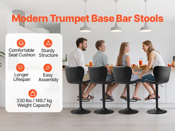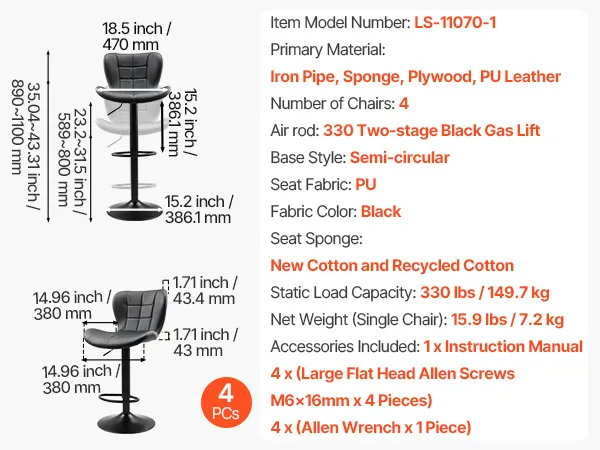 Praktische set: De set bestaat uit vier barkrukken met de afmetingen 470 x 535 x 890 mm (1100 mm) en een zithoogte van 589 mm (23,2–31,5 inch). Deze barkruk is ideaal voor grotere gezinnen of open keukens en is gemakkelijk te verplaatsen tussen eten, gezelligheid en kantooractiviteiten.