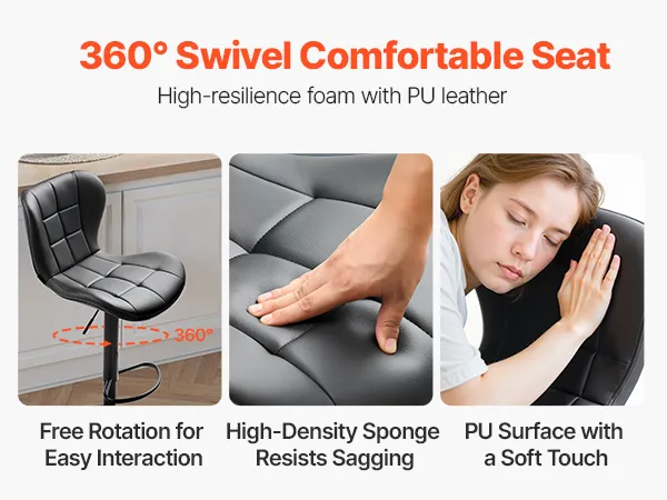 Comfortabel en draaibaar: Dankzij het 360° draaibare ontwerp is de barkruk zeer gebruiksvriendelijk. Het zitkussen is gevuld met hoogwaardig composietschuim en bekleed met PU-leer. De dikke rugleuning past zich comfortabel aan uw rug aan.
