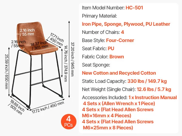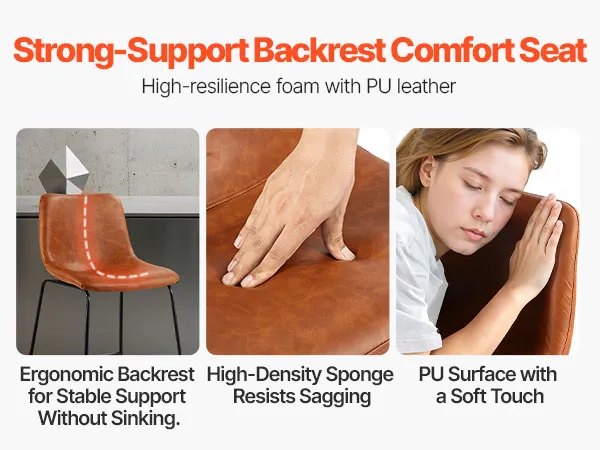 Lichtgewicht luxe en veelzijdigheid: het vintage bruine PU-leer in combinatie met de gestroomlijnde, gebogen rugleuning maakt hem geschikt voor zowel woon- als kantoorruimtes. De standaard zithoogte past op diverse bars en kookeilanden.