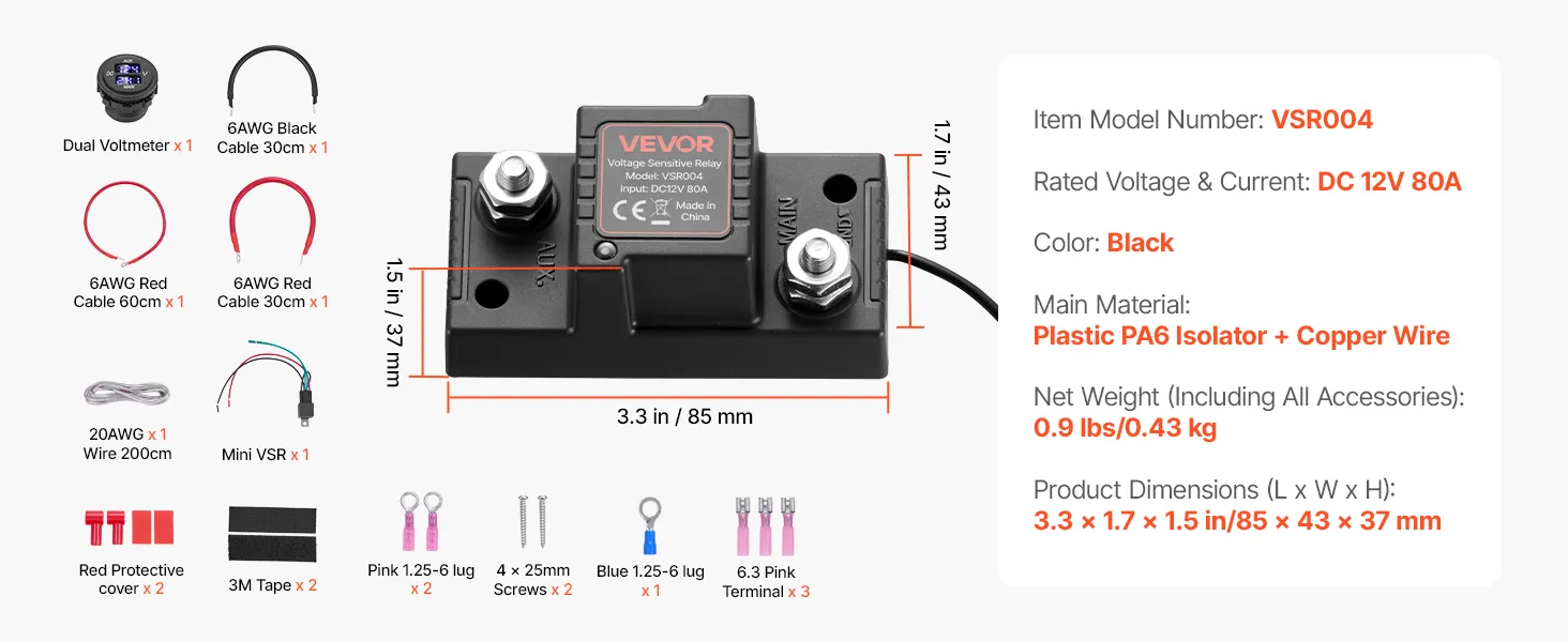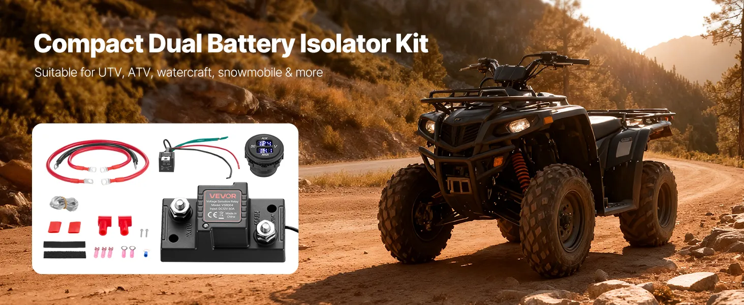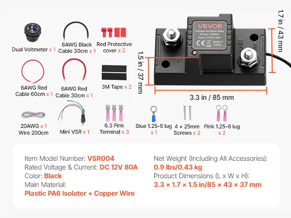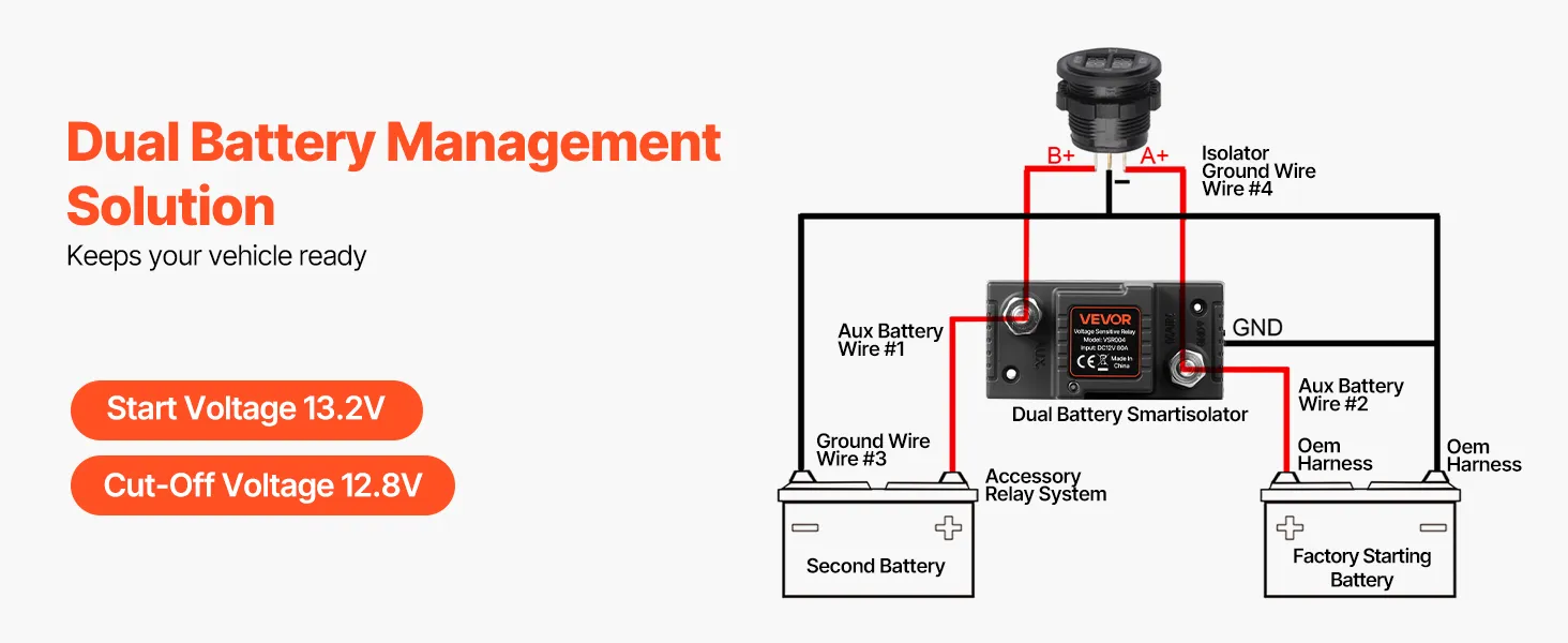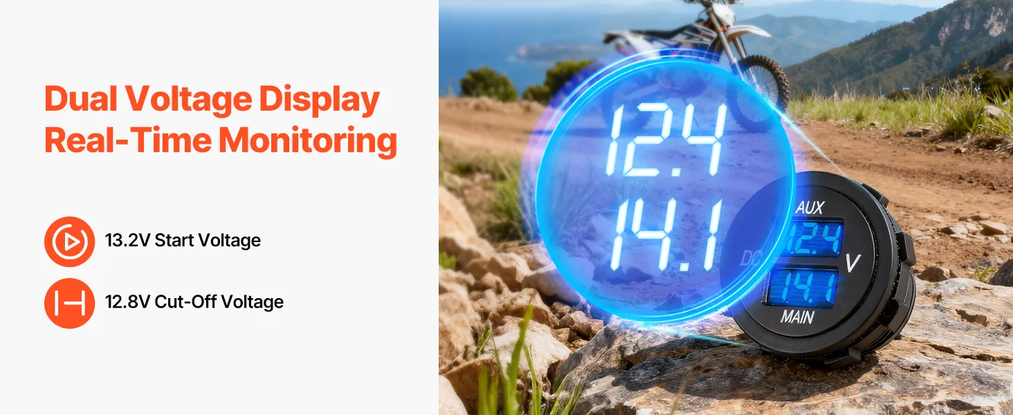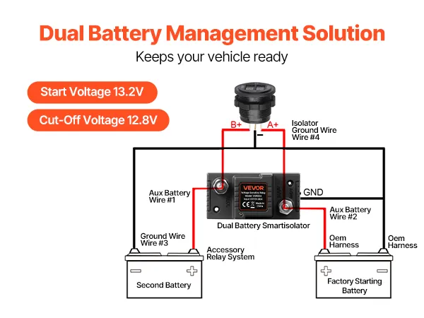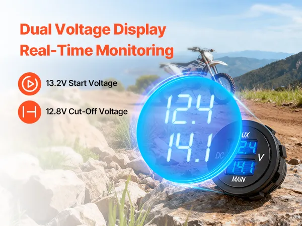 Dubbele spanningsweergave: Uitgerust met een DC-voltmeter met dubbele spanning die de spanning van de hoofd- en hulpaccu in realtime weergeeft. Deze intelligente dubbele accu-isolator kan circuitproblemen eenvoudig diagnosticeren en de systeemstatus veilig bewaken.