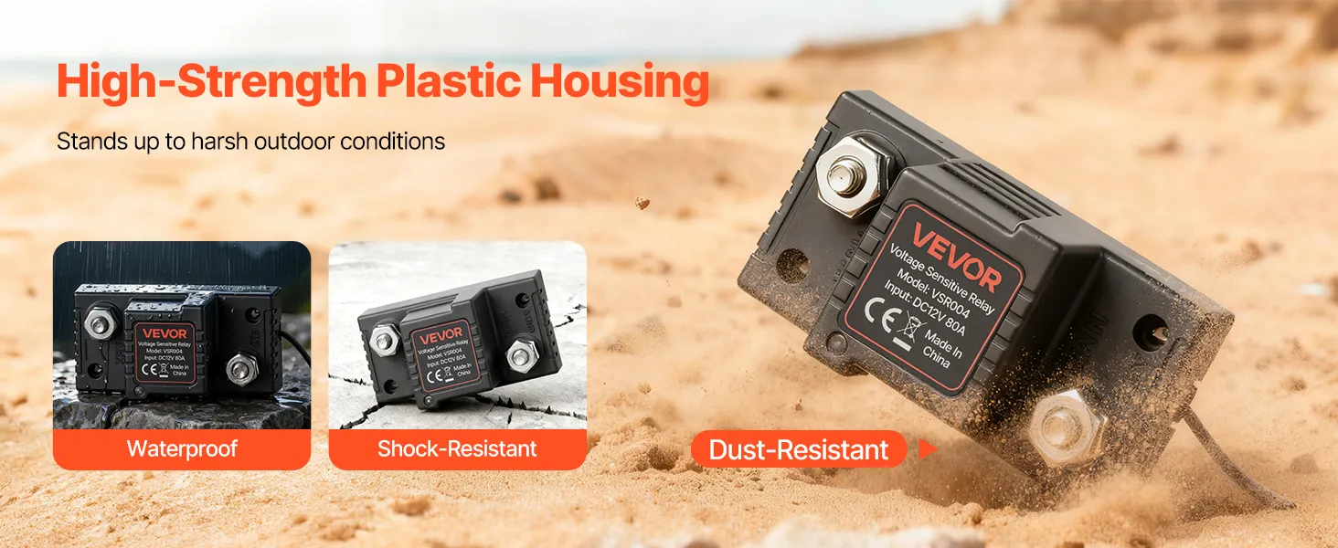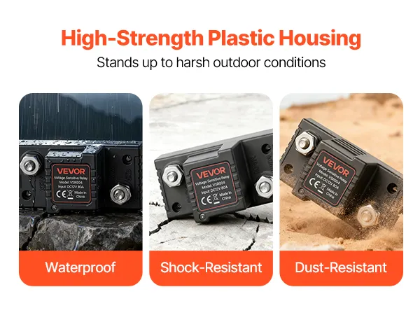 Hoogwaardige behuizing: Dit spanningsgevoelige relais met kunststof behuizing is water-, stof- en schokbestendig. Het is bestand tegen modder, water, kou en trillingen, waardoor de interne elektronica wordt beschermd voor een stabiele werking en een lange levensduur.