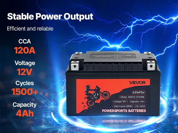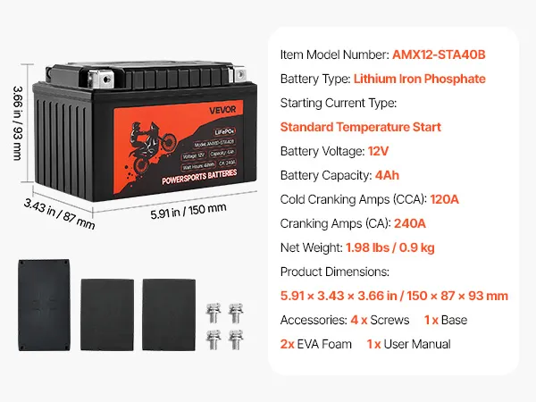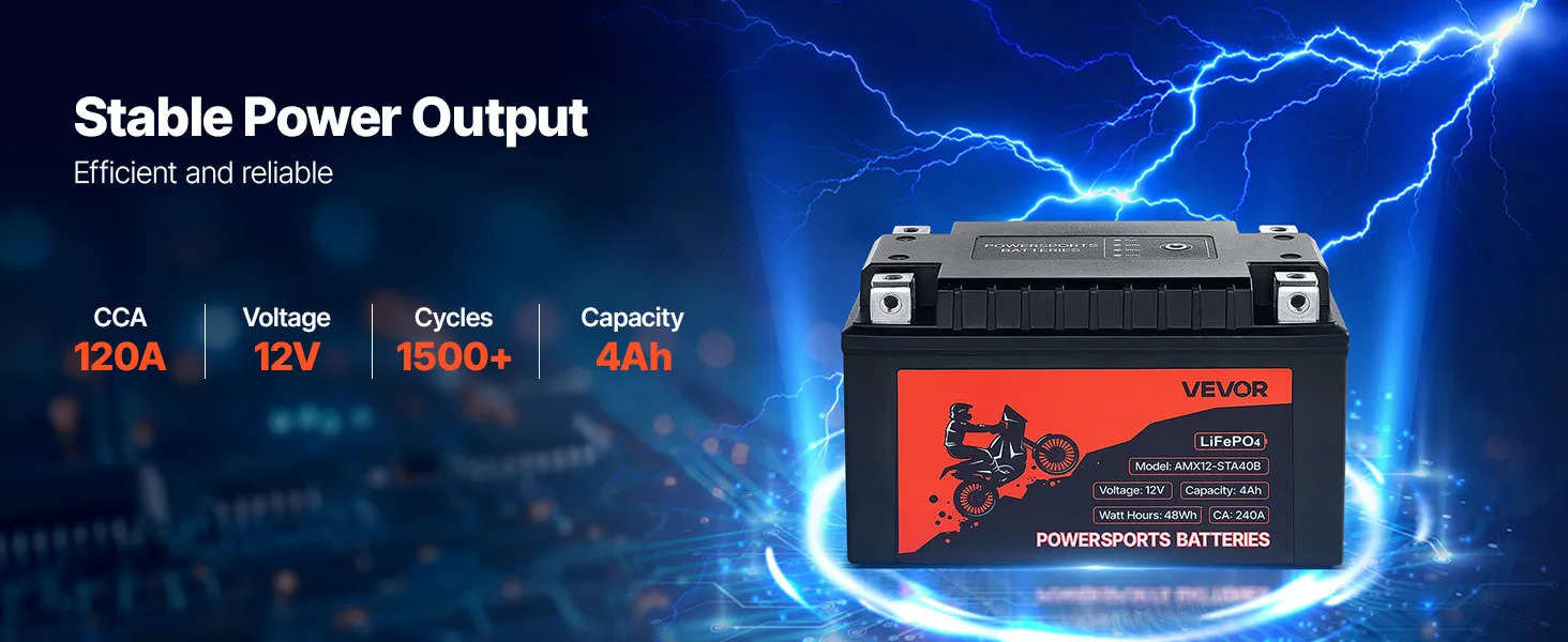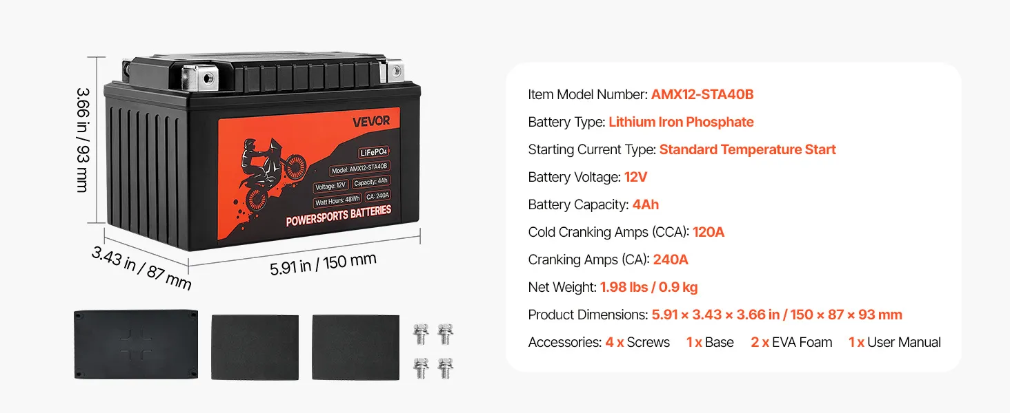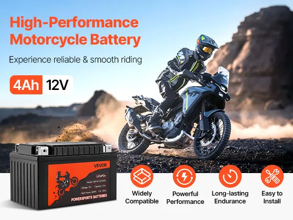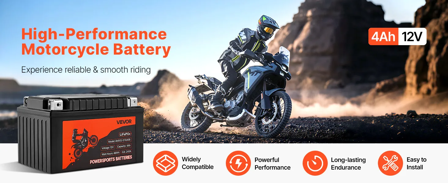 VEVOR Motorfietsaccu, 12 Volt 4 Ah, LiFePO4 Lithium Powersports Accu, Onderhoudsvrij en Krachtig, Geschikt voor ATV, Motorfiets, Jetski, Scooter, UTV en Meer