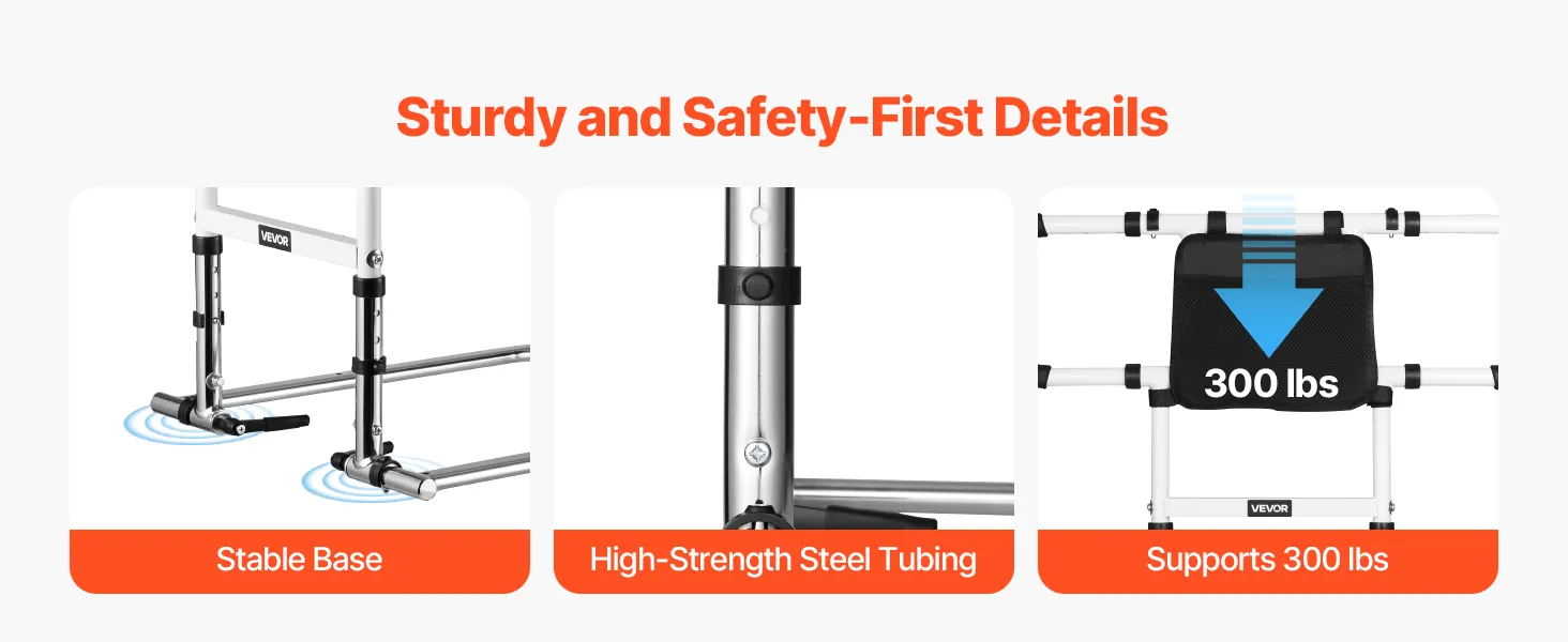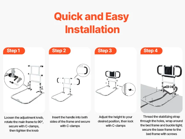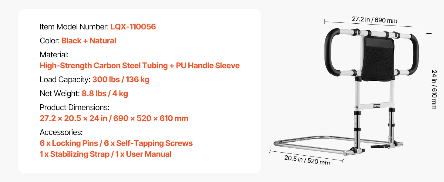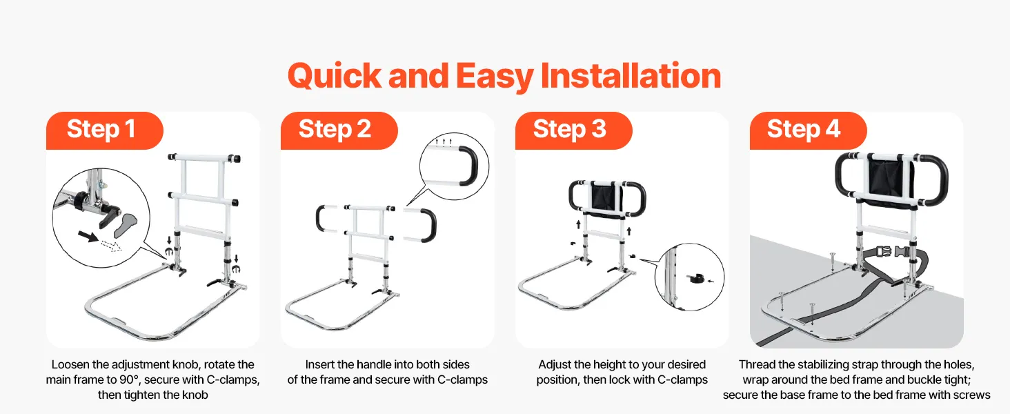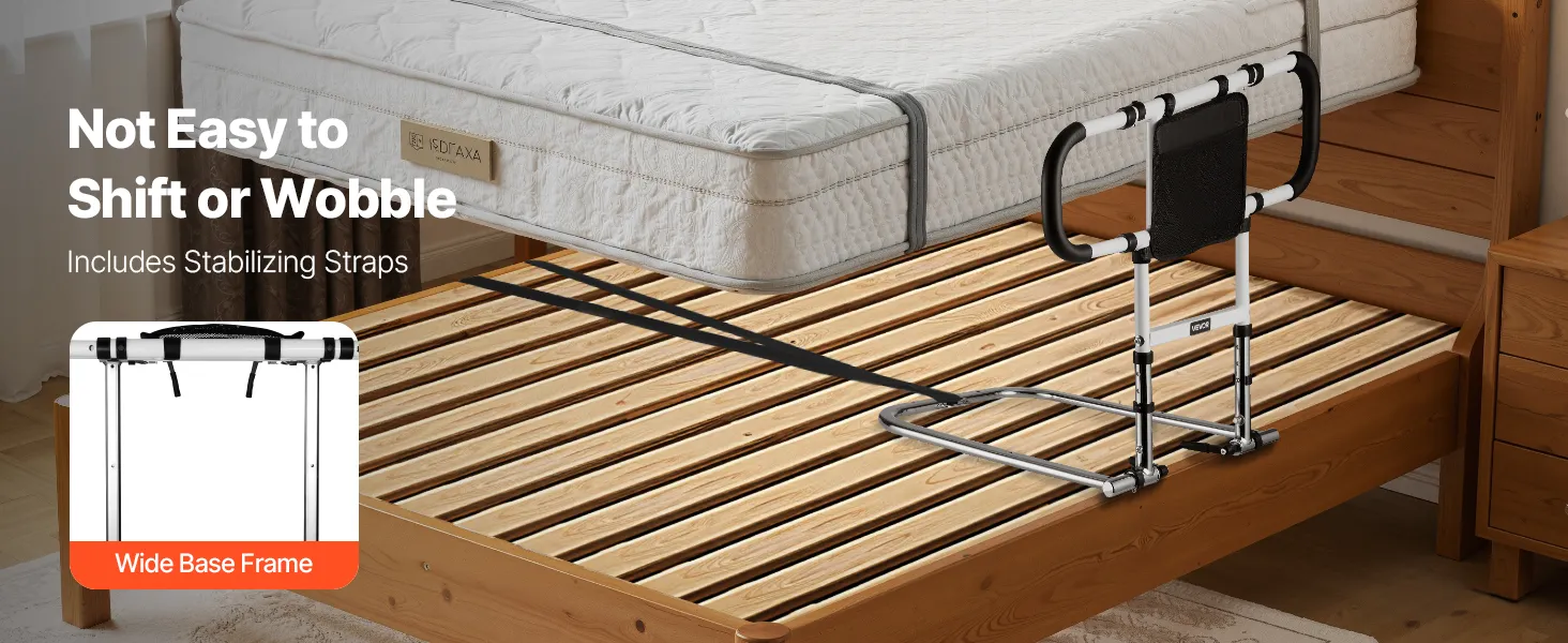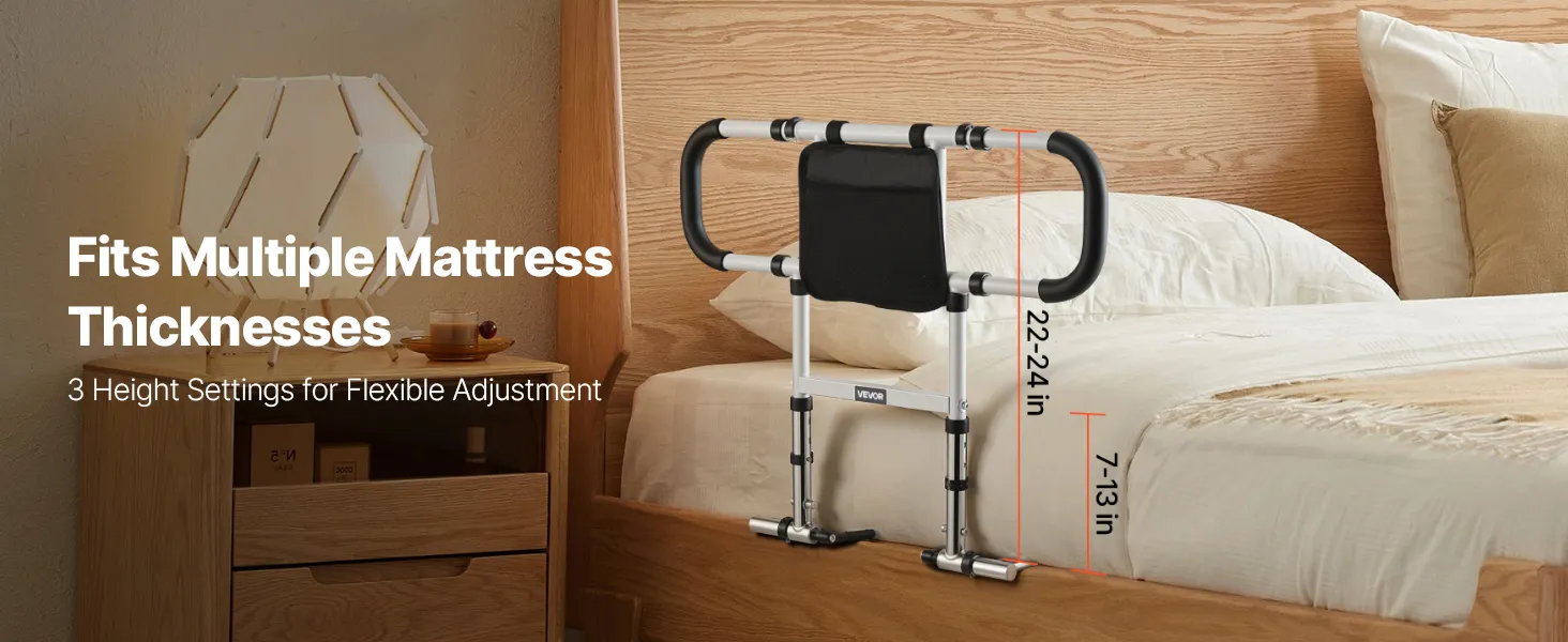Verstelbaar ontwerp: Deze verhoger is 360° inklapbaar en biedt verstelbare handgrepen met een breedte van 533-690 mm en een hoogte van 559-610 mm. Geschikt voor matrassen met een dikte van 178-330 mm en geschikt voor tweepersoons-, queensize- en kingsizebedden.