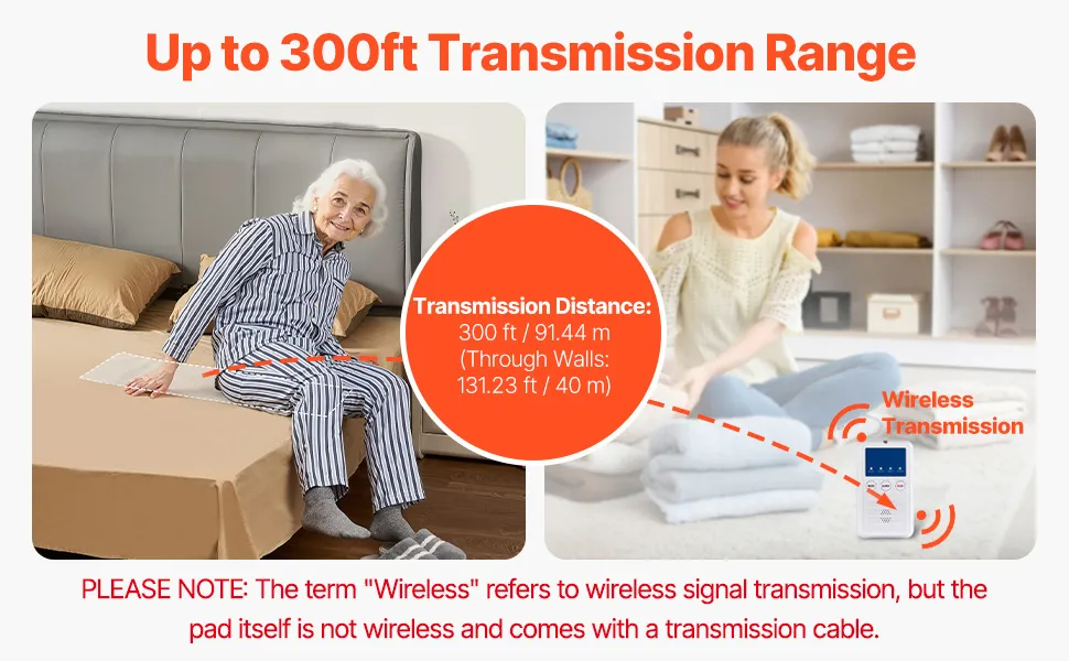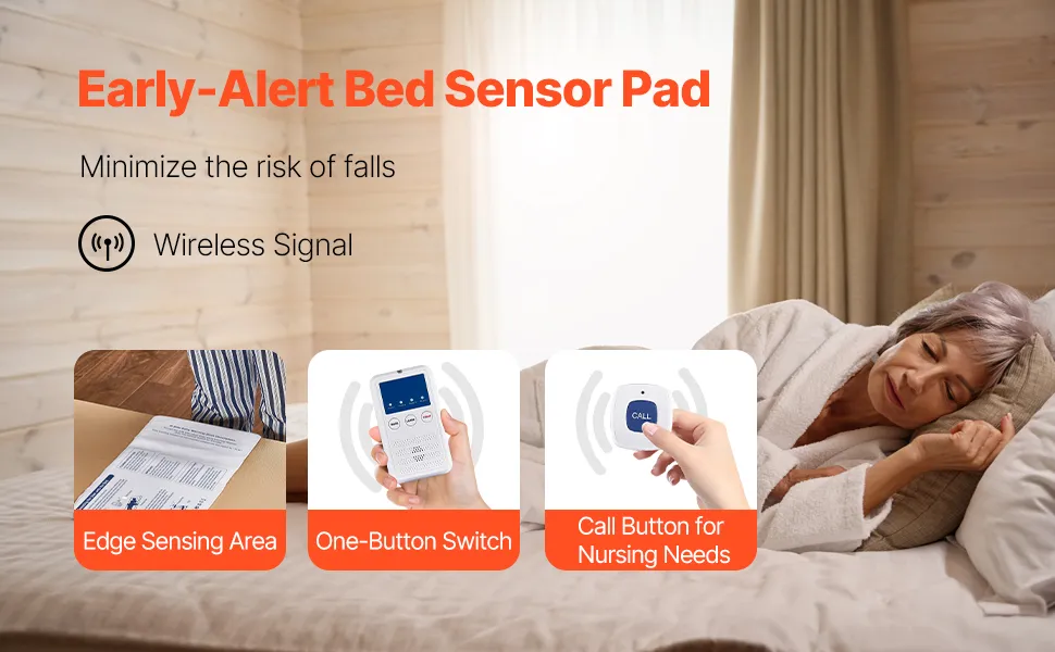 Dit draadloze bedalarmsysteem heeft een draadloos bereik van 91 meter en kan tot 40 meter door muren heen dringen. Hierdoor worden de zorgefficiëntie en de reactiesnelheid aanzienlijk verbeterd en bieden wij u en uw dierbaren een uitgebreidere veiligheidsbescherming.