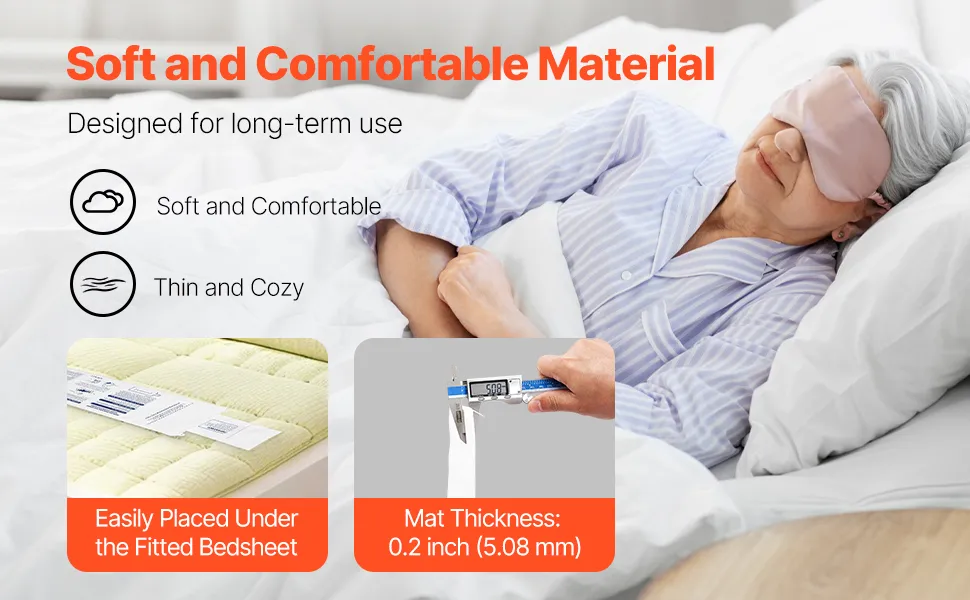 Onze draadloze sensormat is slechts 5,08 mm dik en kan daarom eenvoudig onder het hoeslaken worden geplaatst. LET OP: De term "Draadloos" verwijst naar draadloze signaaloverdracht, maar het kussen zelf is niet draadloos en wordt geleverd met een transmissiekabel.