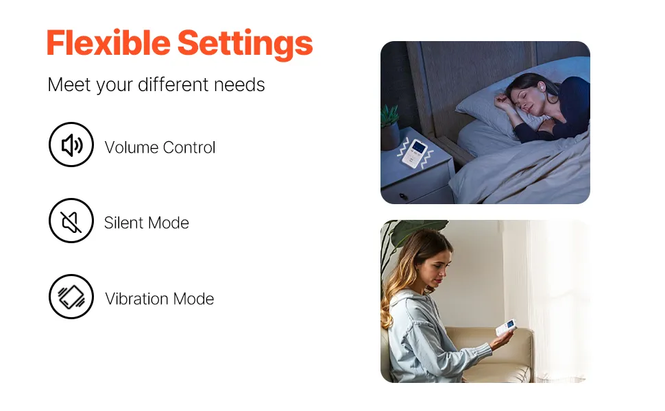Draagbare en lichte pager: Dit pre-alarm bewakingssysteem voor senioren beschikt over een pager met instelbaar volume en een stille en trilstand, zodat u de instellingen kunt aanpassen aan uw behoeften. Het beschikt ook over een waarschuwing wanneer de batterij bijna leeg is en is vervangbaar (LET OP: Batterij niet inbegrepen. Koop compatibele batterijen apart).