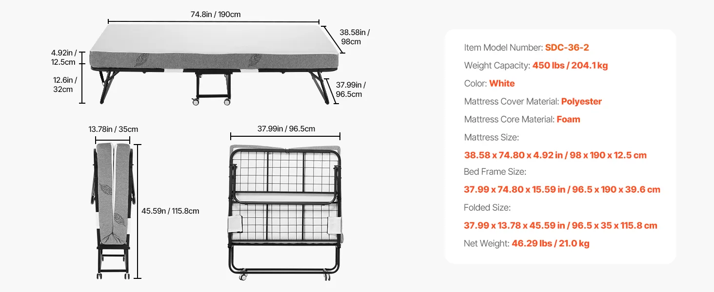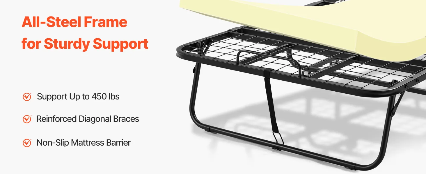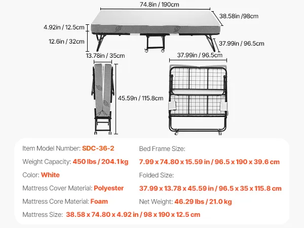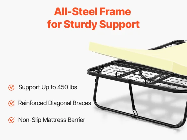 Draagvermogen van 204,1 kg: Ons opklapbed heeft een verdikt en versterkt stalen frame en stevig verbonden metalen onderdelen, wat zorgt voor een solide en duurzame structuur. Met een sterk draagvermogen van 204,1 kg (450 lbs) biedt het betrouwbare ondersteuning voor iedereen in het gezin. Het wiebelt niet en verliest zijn vorm niet, waardoor u stabiel en ontspannen kunt slapen.