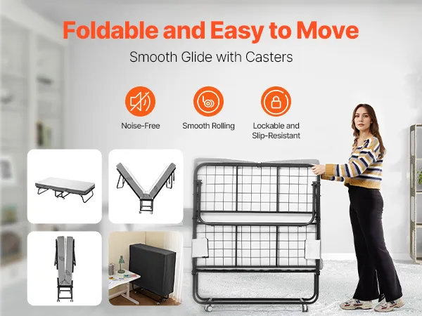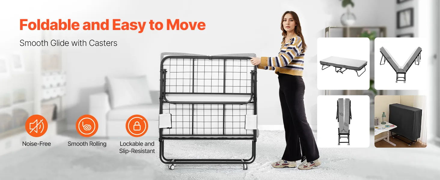 Dit opklapbed is voorzien van vier wielen, waardoor het eenvoudig te verplaatsen is. Eén persoon kan het moeiteloos opzetten en verplaatsen, en alles verloopt stil en soepel. Bovendien kunnen de wielen worden vastgezet om slippen te voorkomen.