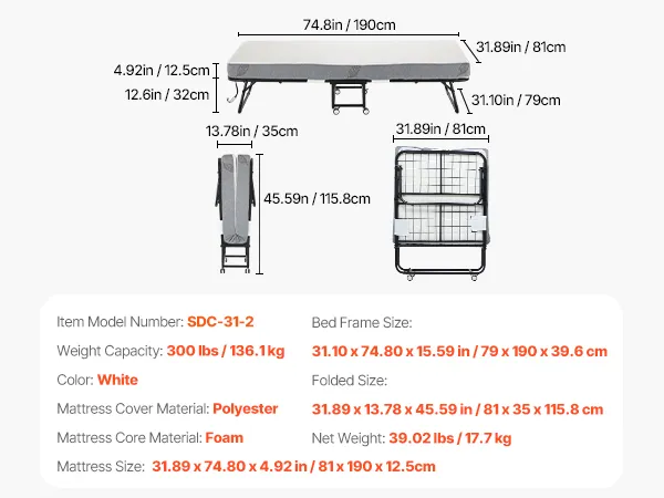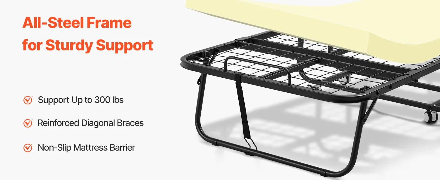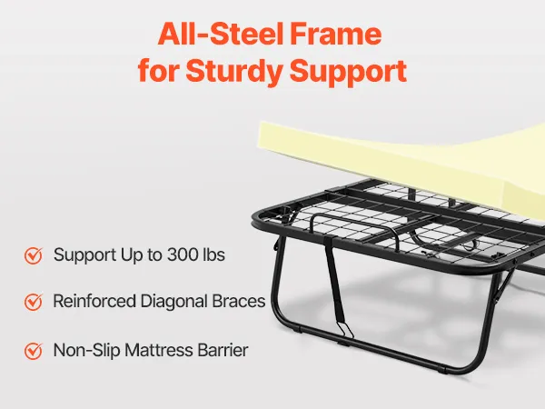 Draagvermogen van 136,1 kg: Ons opklapbed heeft een verdikt en versterkt stalen frame en stevig verbonden metalen onderdelen, wat zorgt voor een solide en duurzame structuur. Met een sterk draagvermogen van 136,1 kg (300 lbs) biedt het betrouwbare ondersteuning voor iedereen in het gezin. Het wiebelt niet en verliest zijn vorm niet, waardoor u stabiel en ontspannen kunt slapen.