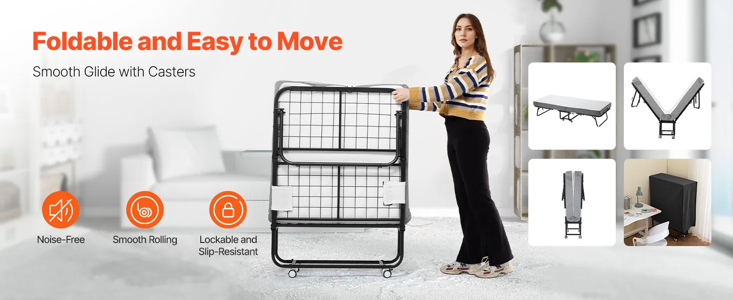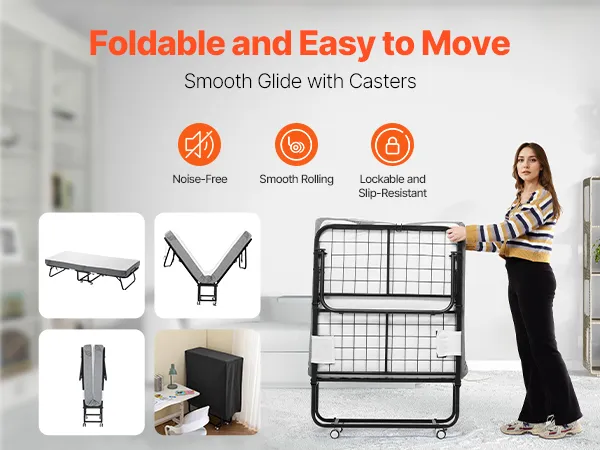 Dit opklapbed is voorzien van vier wielen, waardoor het eenvoudig te verplaatsen is. Eén persoon kan het moeiteloos opzetten en verplaatsen, en alles verloopt stil en soepel. Bovendien kunnen de wielen worden vastgezet om slippen te voorkomen.