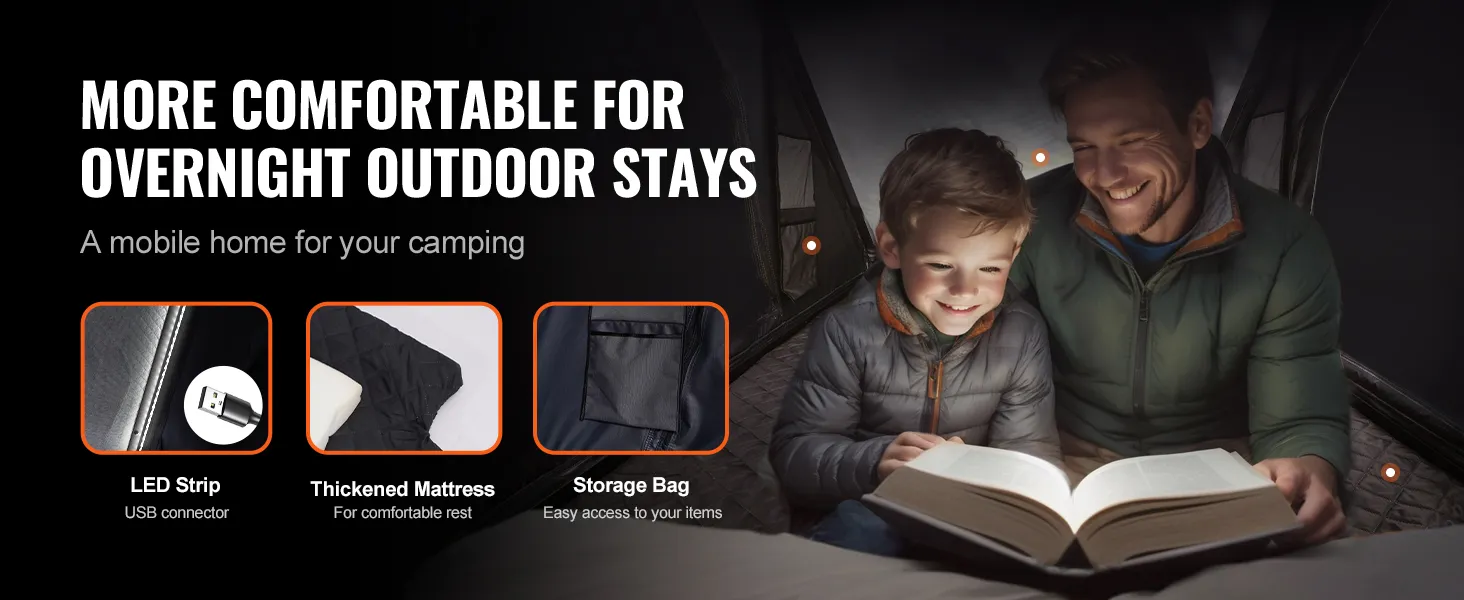 Equipped with a thick foam mattress to ensure a comfortable rest & sleep for you and your family, along with a white LED light strip and storage bag for convenient nighttime lighting and storage.