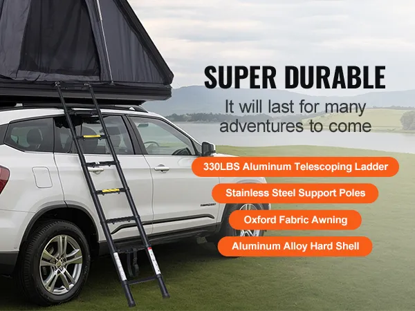 7.5 FT Telescoping Ladder: Comes with a 7-section aluminum telescoping ladder with a maximum load capacity of 330 lbs, making it easy to enter the tent. The ladder's length is adjustable, extending up to 7.5 ft / 2.3 m and shortening to 2.4 inches / 720 mm to fit different vehicle heights.
