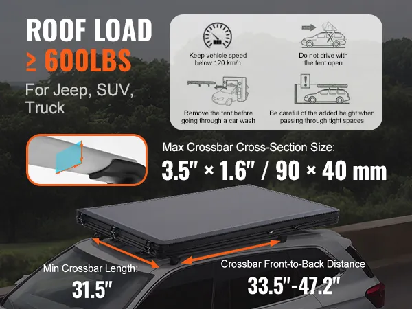 Accommodates 2 Adults + 1 Child: The triangular rooftop tent features inflatable poles for easy setup, quickly transforming into a spacious interior that can accommodate 2 adults and 1 child. Suitable for Jeep, SUV, and truck models with a roof weight capacity ≥ 600 lbs, it’s an ideal choice for family outdoor adventures.