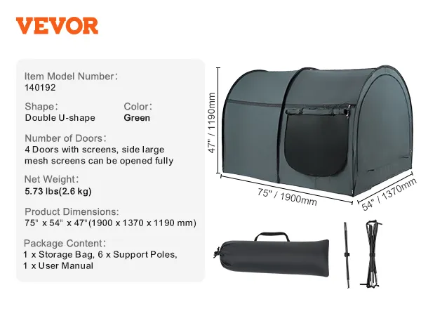Vier deuren met net: Vier praktische ingangen zorgen voor comfortabel komen en gaan. Elke deur is voorzien van dubbele ritssluitingen, twee lagen ademend gaas ter bescherming tegen muggen en zwarte stof voor privacy, waardoor de tent geschikt is voor drukke huishoudens.