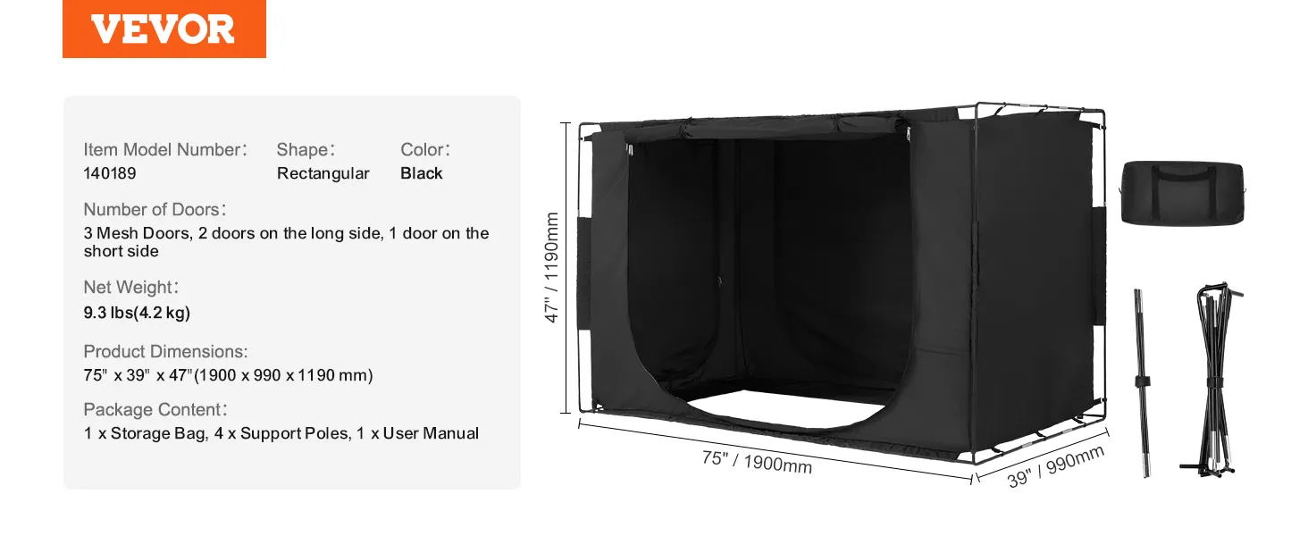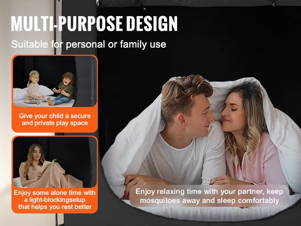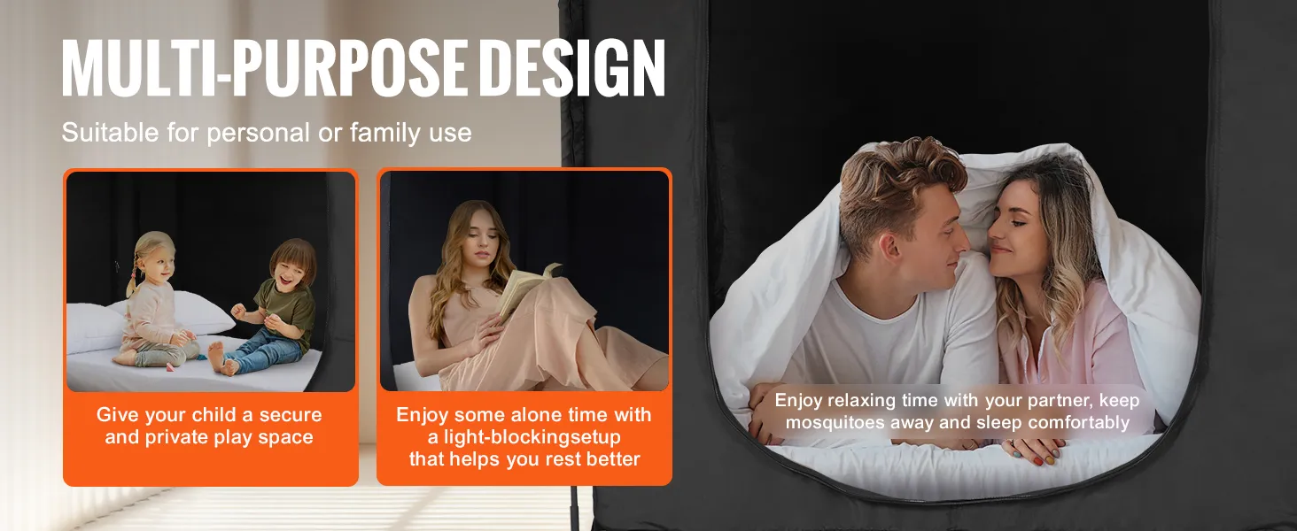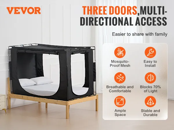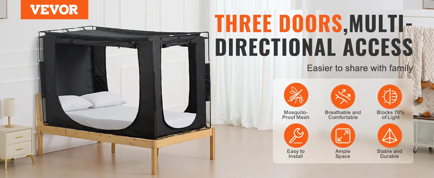 Met afmetingen van 1900 x 990 x 1190 mm biedt de bedtent 70% lichtbescherming en dus privacy in elke kamer. Het beschikt over drie toegangspunten met mesh en privacystof, evenals een vak voor een mobiele telefoon, een nachtlampjehaak en klittenband om op te laden.