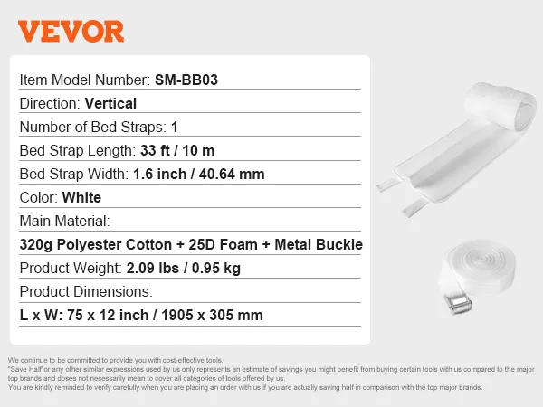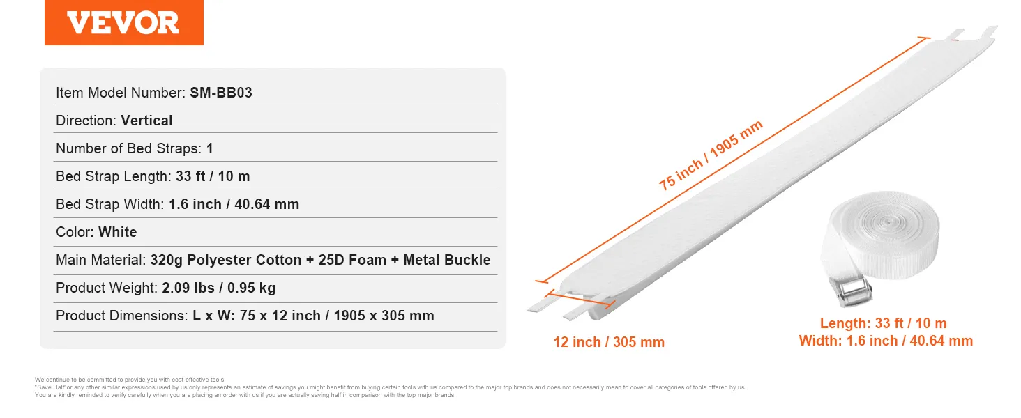 Stabiel en veilig: Deze bedconnector is verkrijgbaar in de maten 75 x 12 inch (1905 x 305 mm) en is voorzien van een elastische katoenen band van 10 meter en metalen sluitingen om matrassen veilig op hun plaats te houden zonder te verschuiven of te bewegen.