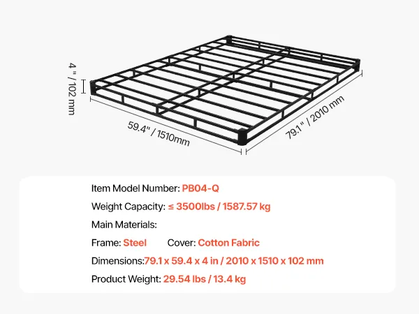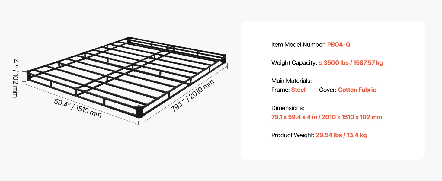 VEVOR Queensize boxspringbedframe met wasbare stoffen hoes, metalen frame voor queensize bedden, matrasbodem van 102 mm, max. draagvermogen van 1587 kg (2010 x 1510 x 102 mm)