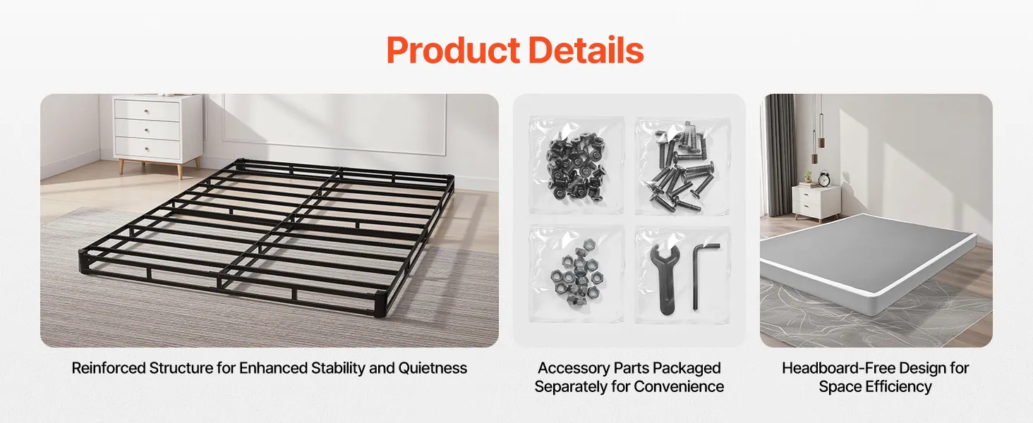 Dankzij de verstevigde structuur, het ruimtebesparende ontwerp zonder hoofdbord en de eenvoudige montage en mobiliteit biedt het uitstekende ondersteuning voor een betere nachtrust.