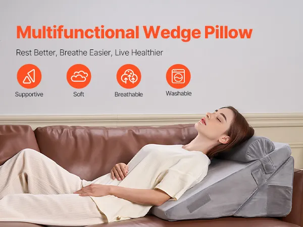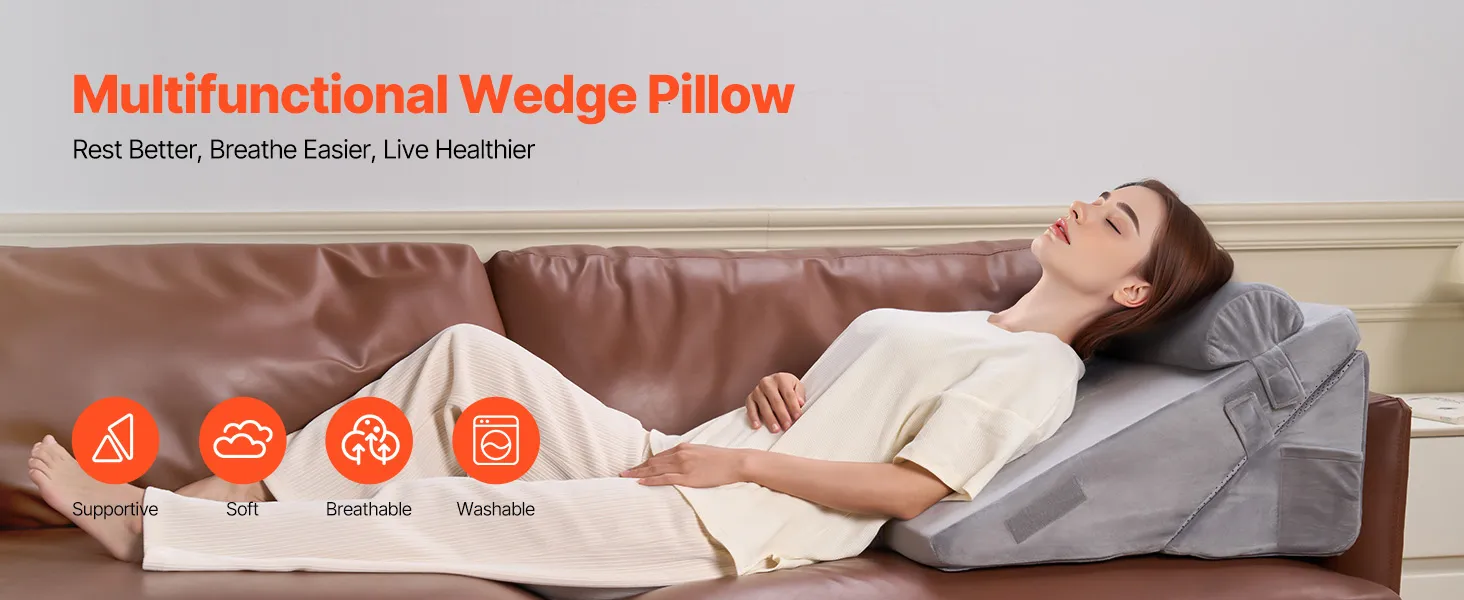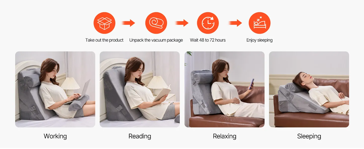 The multifunctional wedge pillow is mainly used to improve sleep quality, relieve physical discomfort, and assist in physical rehabilitation. It also features comfort, adjustability, and strong support, making it an ideal snoring pillow or post-surgery pillow.