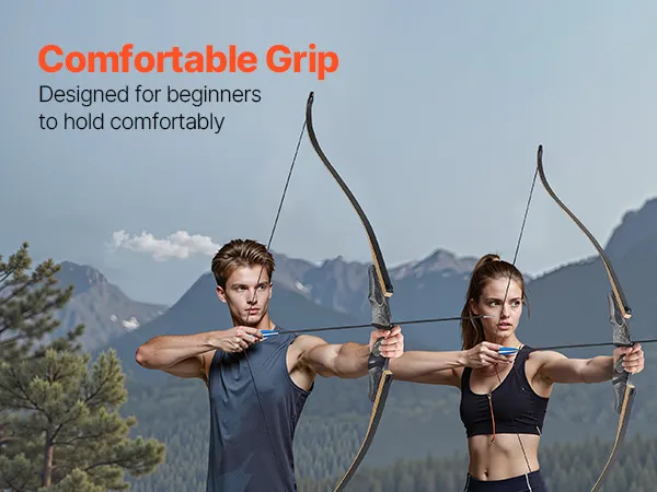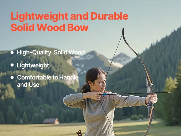Ergonomisch ontwerp: De recurveboogset heeft een afgeronde en fijn bewerkte houten handgreep die zich aanpast aan de natuurlijke ronding van uw hand. Dit ontwerp vermindert vermoeidheid bij langdurig gebruik en zorgt ervoor dat u geconcentreerd kunt blijven tijdens het boogschieten.