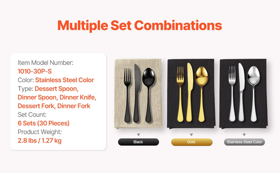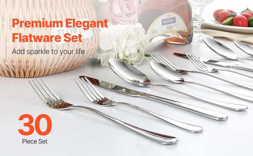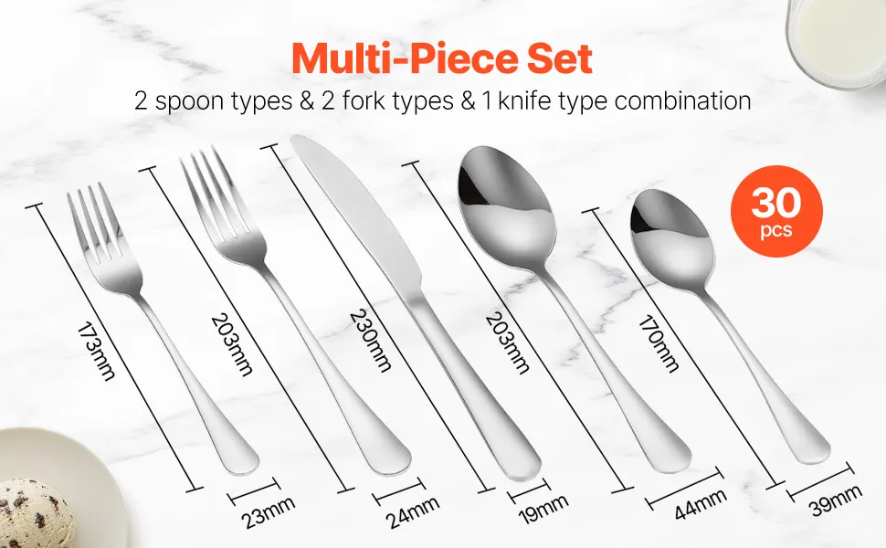 Bestekset van 30 stuks: Deze bestekset bestaat uit 6 tafelvorken, 6 tafellepels, 6 tafelmessen, 6 dessertvorken en 6 dessertlepels. Dit maakt het een onmisbaar item voor thuis en in restaurants. Of het nu gaat om dagelijkse maaltijden, het bereiden van diners of feestjes, deze bestekset is een onmisbaar eetgereedschap