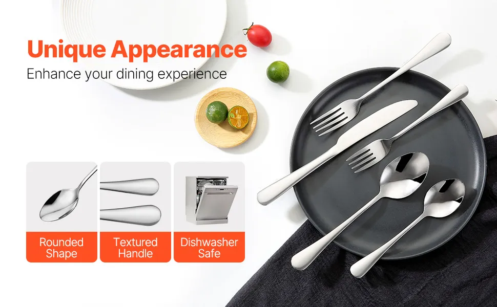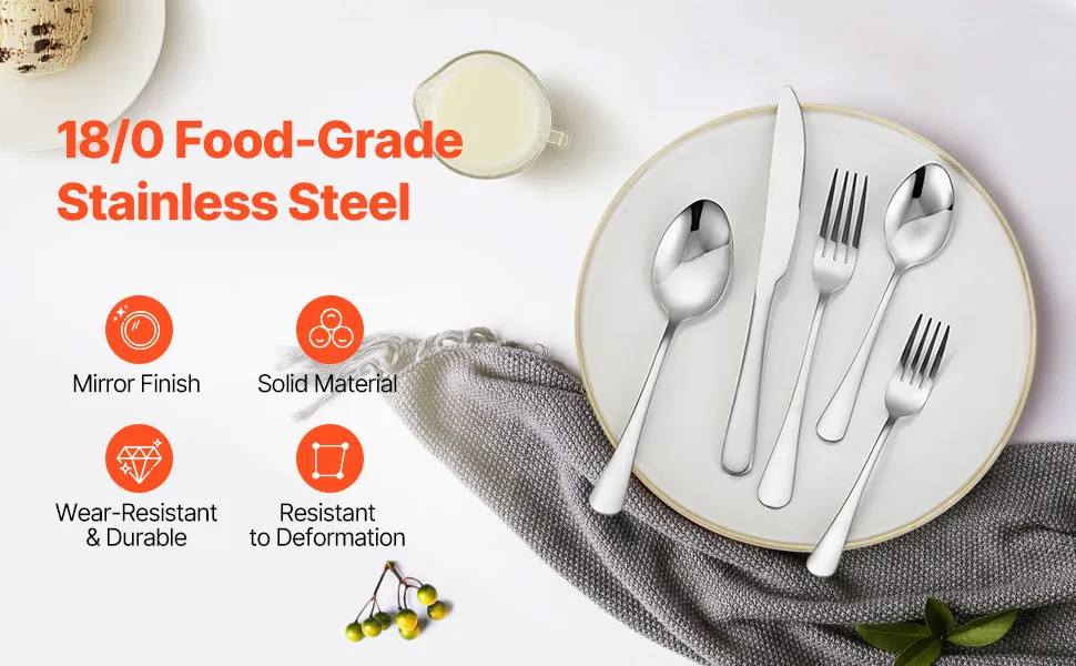 Hoogwaardig roestvrij staal: Deze bestekset is gemaakt van hoogwaardig roestvrij staal 18/0, is duurzaam, corrosiebestendig, roestvrij en heeft een uitstekende balans. Het gladde randontwerp zorgt voor comfort tijdens gebruik. Het is vaatwasserbestendig, heeft een perfect gewicht en is ontworpen voor langdurig gebruik.