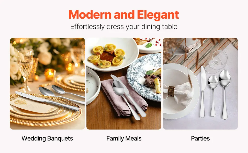 Veelzijdig: Dit elegante, duurzame bestek van roestvrij staal is een praktische en stijlvolle keuze voor thuis, in hotels, in de keuken, op feesten, op de camping, bij picknicks, in restaurants, op bruiloften en nog veel meer. Het voegt een vleugje verfijning toe aan je leven en is een perfecte optie voor een housewarming of als cadeau voor elke gelegenheid