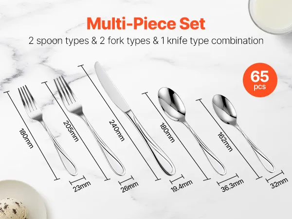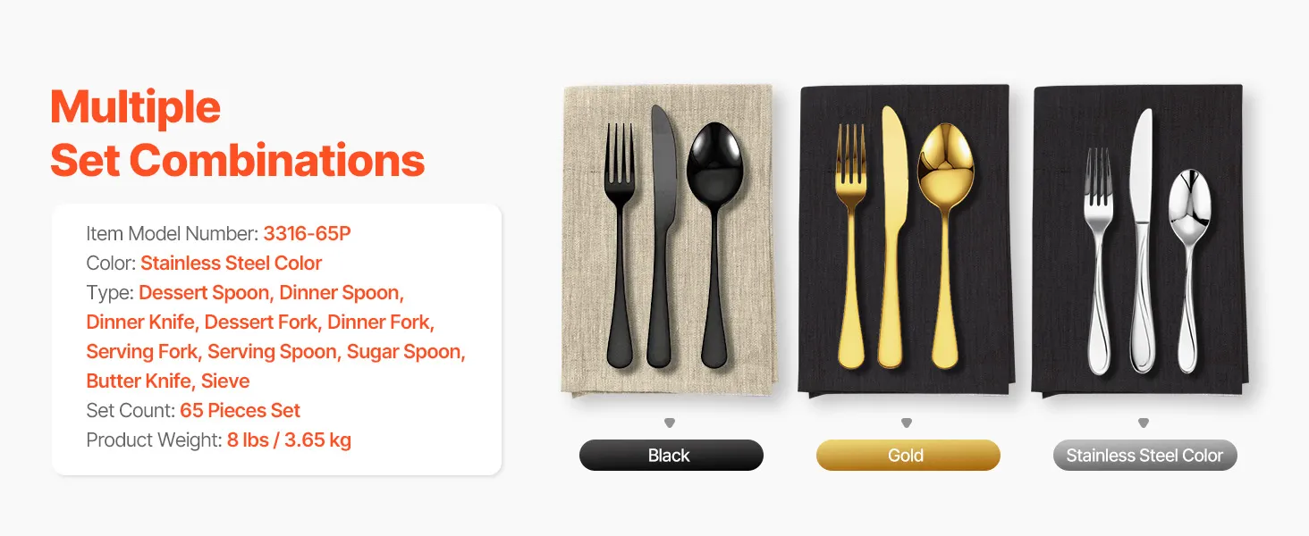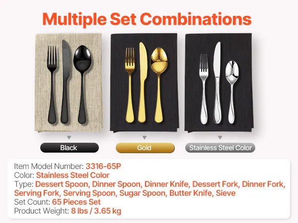 65-Piece Flatware Set: This silverware set includes 12 dessert spoons, 12 dinner spoons, 12 dinner knives, 12 dessert forks, 12 dinner forks, 1 serving fork, 1 serving spoon, 1 sugar spoon, 1 butter knife, and 1 sieve, making it an essential item for both home and restaurant use. Whether for everyday meals, dinner preparation, or parties, this flatware set is an indispensable dining tool