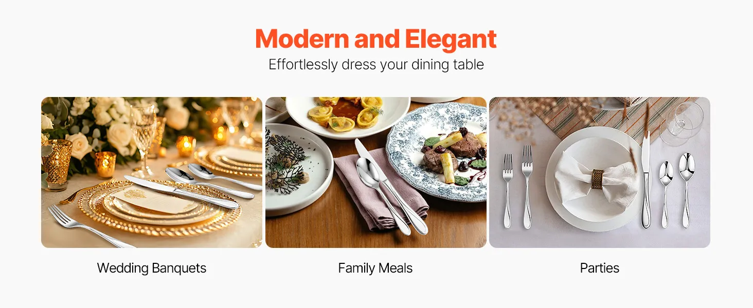 A high-end flatware set, essential for both home and restaurant use. Whether for daily dining, preparing a meal, or hosting a party, this silverware set is an indispensable tool for every dining occasion.