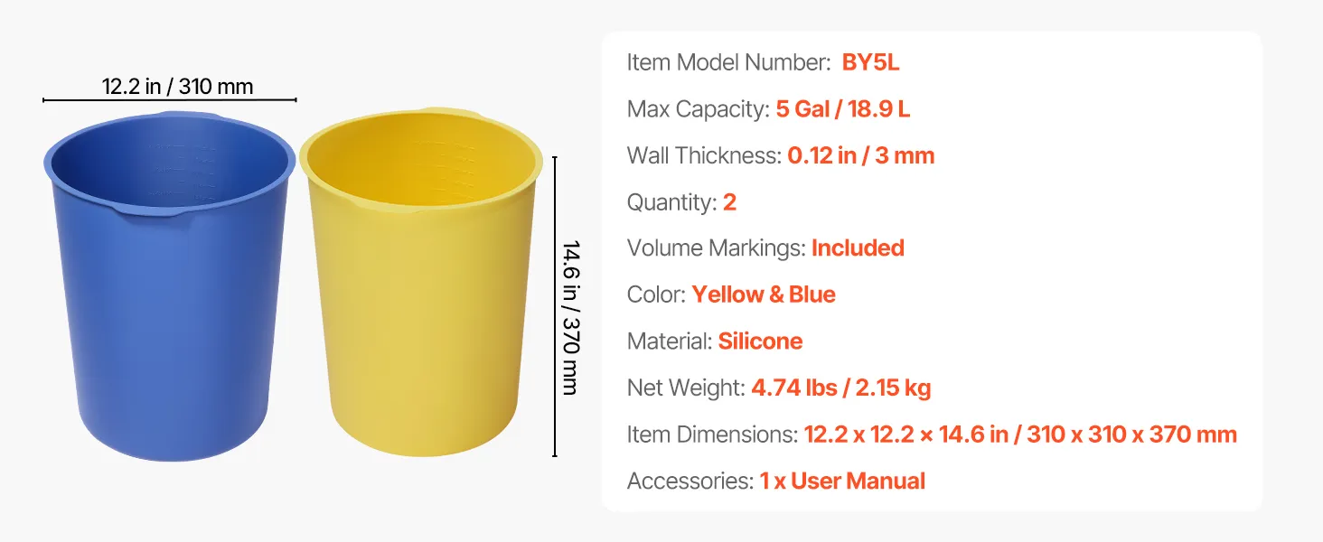Duidelijke maatstreepjes: Precisie is cruciaal. Deze siliconen liner is voorzien van gemakkelijk afleesbare gallon- en litermarkeringen voor nauwkeurig mengen. Verminder materiaalverspilling en behaal consistente resultaten. U hoeft zich geen zorgen meer te maken over het verpesten van uw werkruimte.