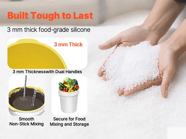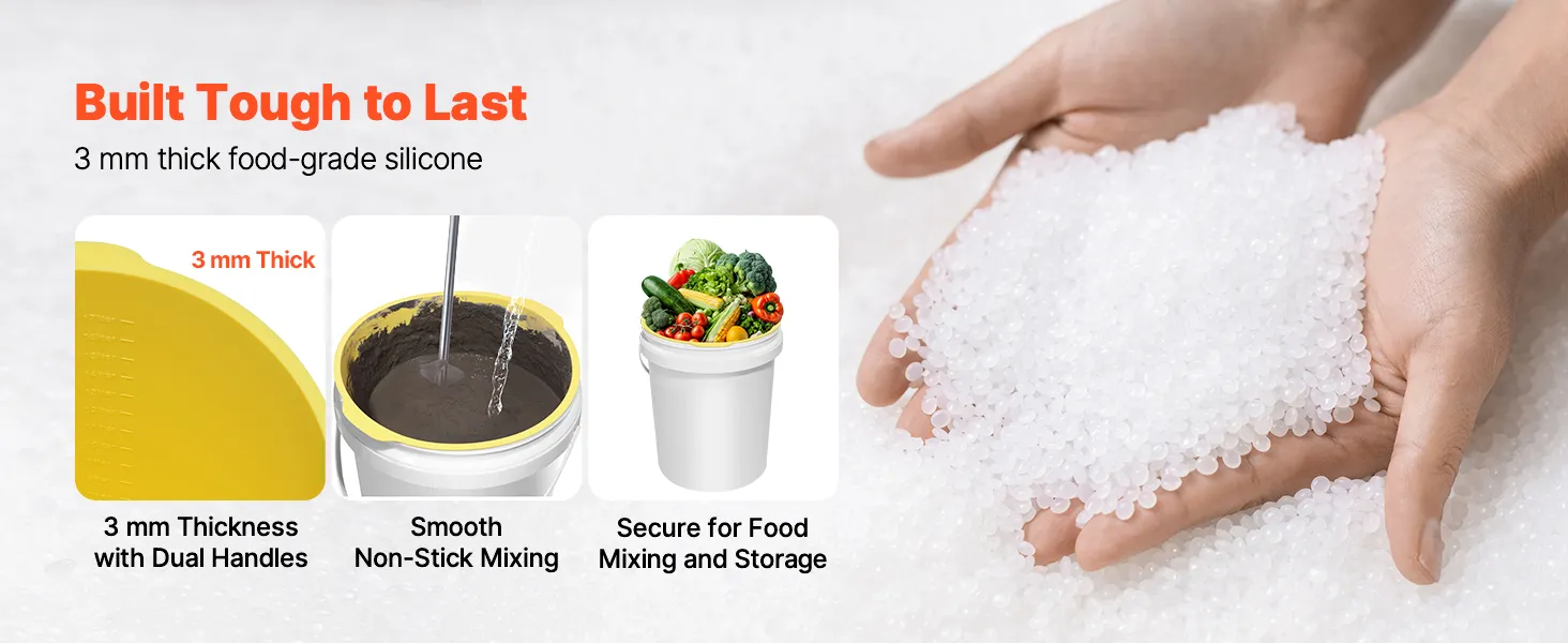 Deze dikke siliconen inzet met twee handgrepen past perfect in standaard emmers van 19 liter. Hij is antiaanbak en glad voor moeiteloos mixen. Veilig voor direct contact met voedsel. Stevig, herbruikbaar en duurzaam.