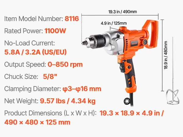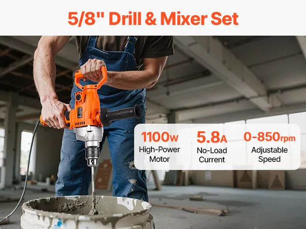 Krachtige motor: Deze snoerloze boor- en roerset van 5/8 inch (15,89 mm) heeft een motor van 1100 watt en een onbelaste stroom van 3,2 ampère. Hij is ontworpen voor veeleisende taken en biedt de koppel en snelheid die nodig zijn om boor- en roerklussen sneller en efficiënter uit te voeren.