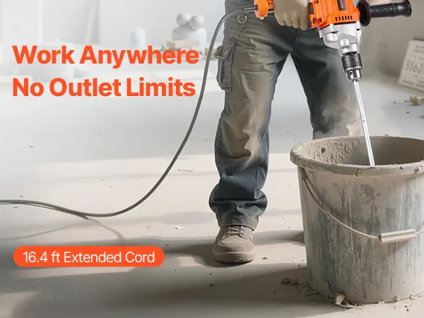 Gebruiksvriendelijke details: De handbediende betonmixer is ontworpen voor gebruiksgemak en beschikt over een draaibare handgreep aan de achterkant, een trillingsdempende rubberen handgreep en een vergrendelknop. De extra lange kabel van 5 meter geeft u meer bewegingsvrijheid op uw werkplek.