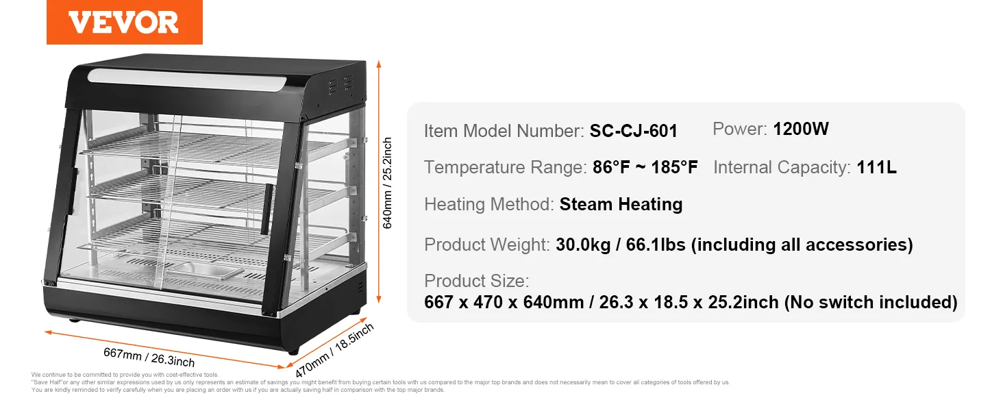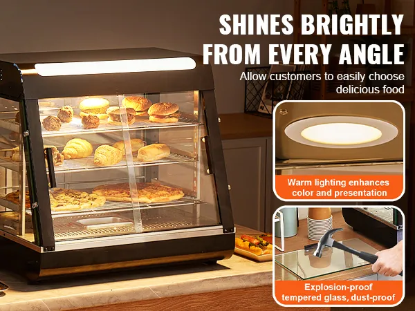 Made of high-quality stainless steel and tempered glass, designed for heating and displaying food, with decorative lighting to make food more enticing and shiny.