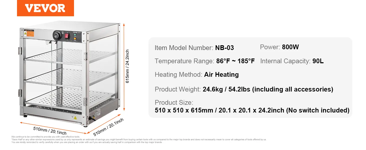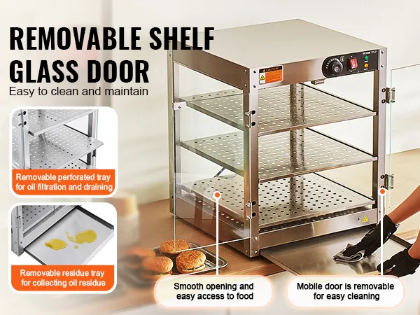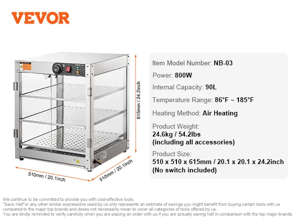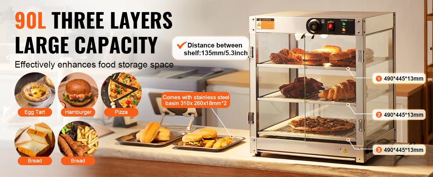 3-laags en grote kamer: Afmetingen: 510 x 510 x 615 mm (20,08 x 20,08 x 24,21 inch). Onze voedselverwarmer op aanrecht heeft twee ruime, voedselveilige planken waarop u voedsel van verschillende grootte vrij kunt plaatsen. Ideaal voor het bewaren en presenteren van pizza, pannenkoeken, kip of hamburgers.