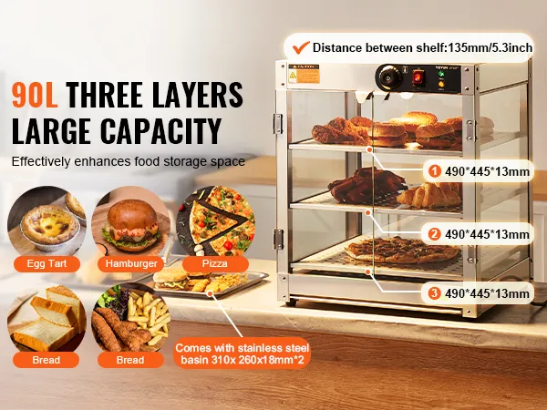 VEVOR 3-laags commerciële voedselverwarmer, 800W voedselverwarmer met licht voor een betere presentatie van het eten, temperatuurregeling van 30°C tot 85°C, grote capaciteit van 90 liter voor hamburgers, pizza, brood en gefrituurde kip