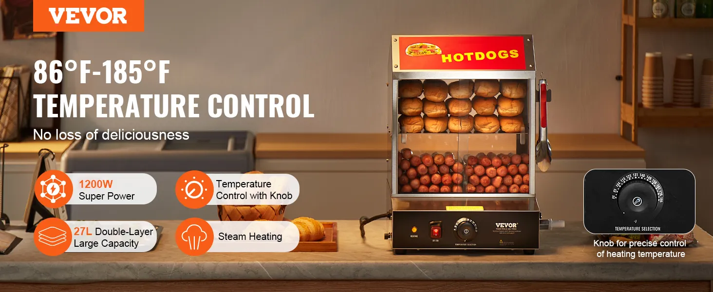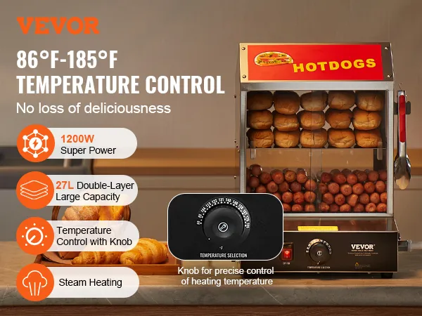 Temperature Control with Knob: Are you worried about your hot dogs getting cold? No need to worry! Hot dogs and buns are heated through internal steam, ensuring that every item stays warm. With a wide temperature range of 86℉-185℉ (30-85℃), you can keep your food at the perfect temperature at all times. The temperature is easy to control with a simple knob adjustment.