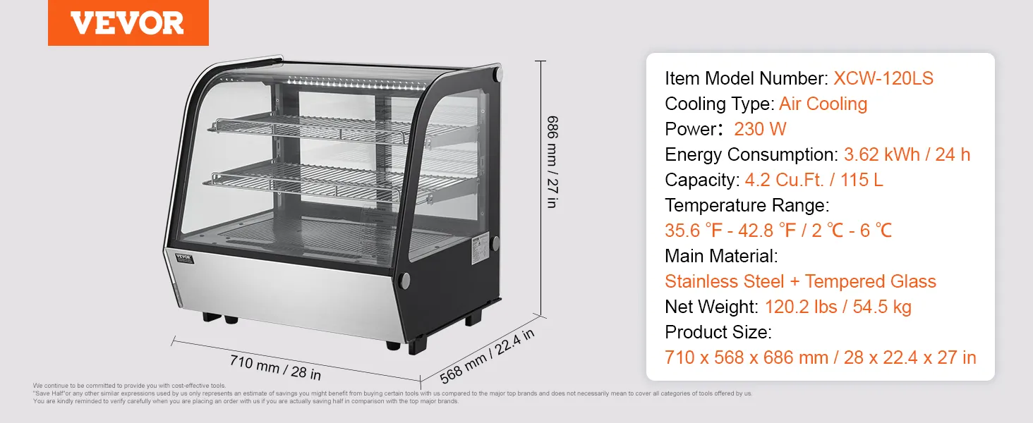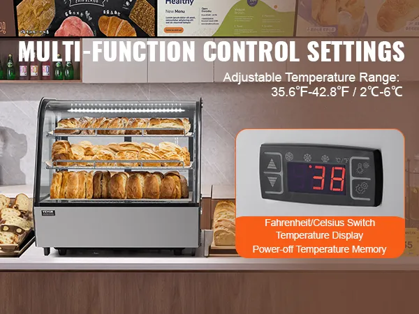 Quick Cooling: The refrigerated display case features a Turbo fan cooling system, capable of rapidly cooling down to the set temperature (temperature range: 35.6-42.8°F / 2-6°C) and maintaining the internal temperature within the designated range. It is energy-efficient, consuming as low as 3.63 kW.h/24h, ensuring your food stays in optimal condition.