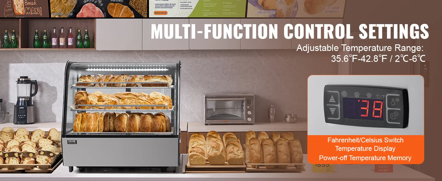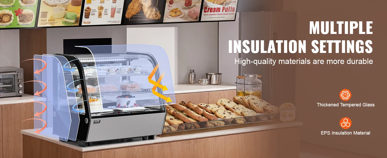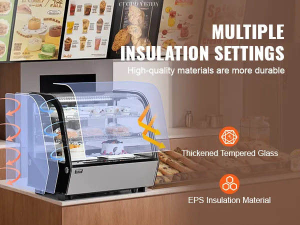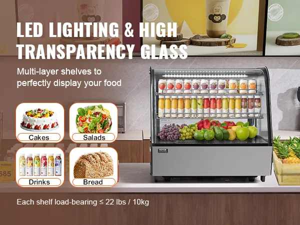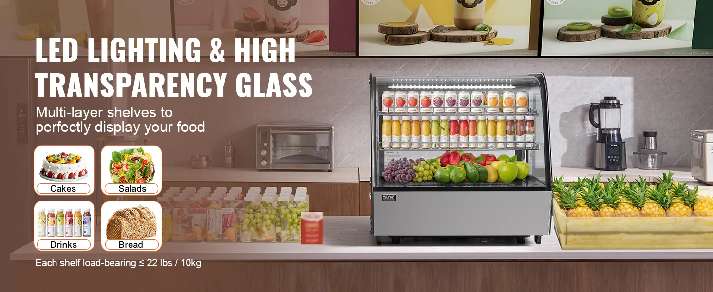 The 2 adjustable shelves allow for flexible placement of items at different heights. The LED lights and high-transparency tempered glass enhance the appeal of the food, increasing the likelihood of customer purchases.