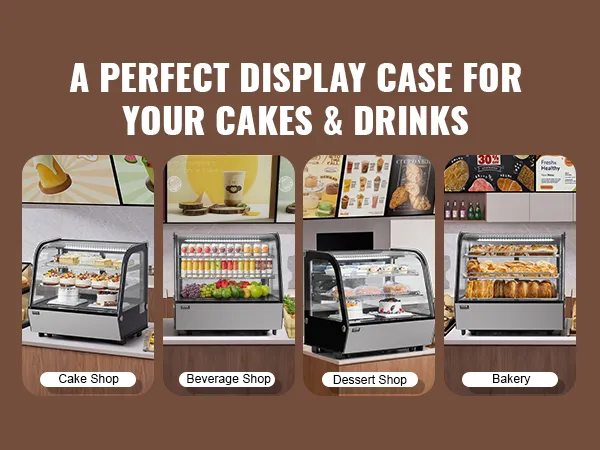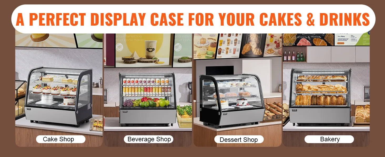 Countertop Display Case: The streamlined design easily fits into various corners, making it perfect for use in bakeries, pastry shops, beverage stores, and dessert shops.